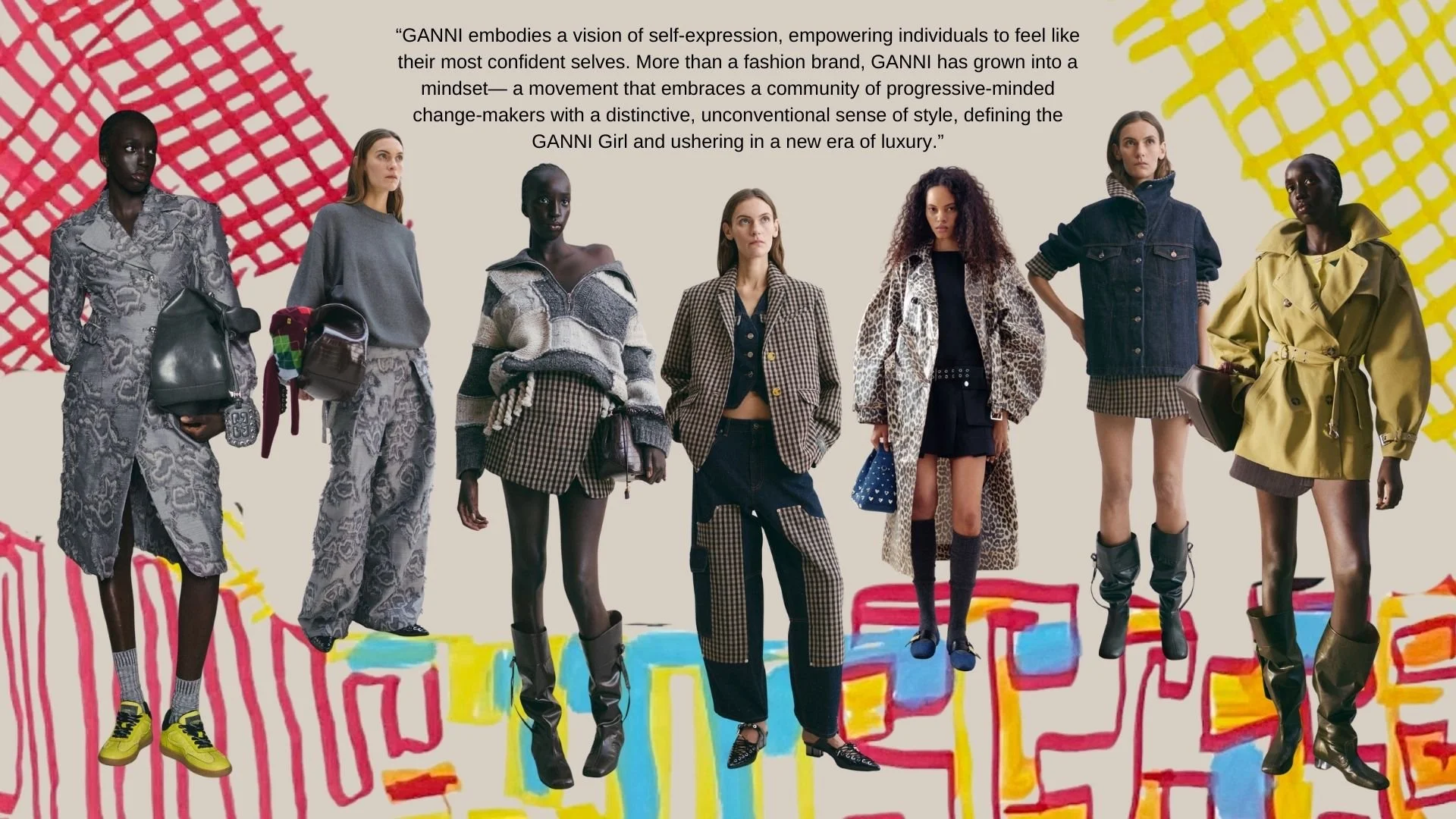 Silhouettes are designed to move with the body, and materials emphasize longevity, adaptability, and reduced impact. In alignment with GANNI’s commitment to circularity, the collection treats wear, repair, and repeated use as essential to the design process, framing sustainability as an extension of function rather than an afterthought.