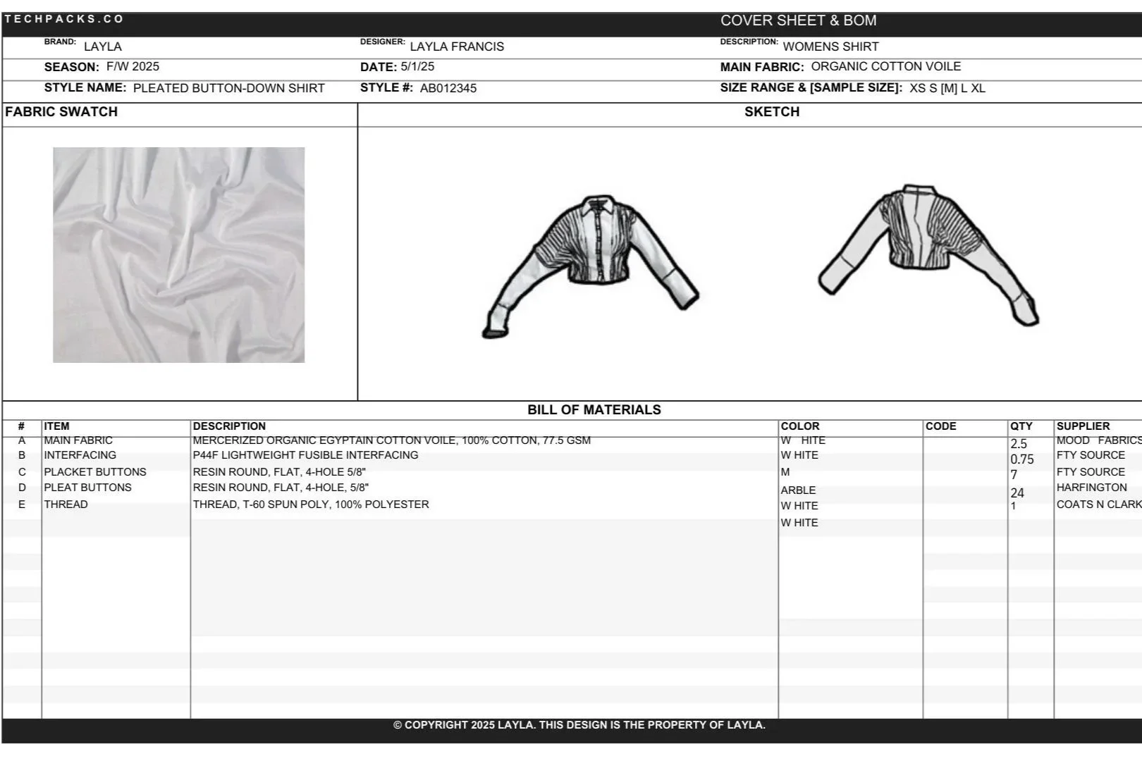 Using CLO 3D, Layla developed the patterns, constructed the first prototype, created the tech pack, and produced digital editorial imagery. The design reflects her philosophy of empowering women through adaptable clothing while reducing fashion’s environmental footprint—transforming a single shirt into two distinct styles.